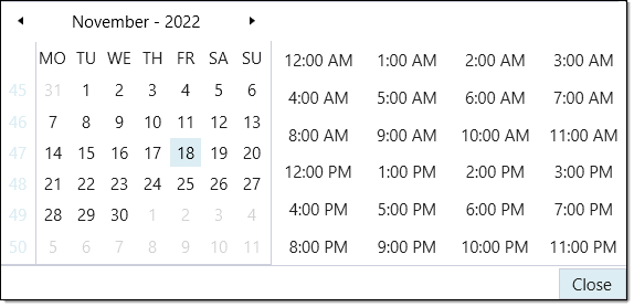 and using the drop-down calendar. Click Close to save the selected date.