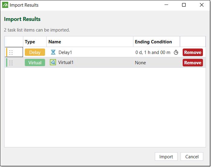 Click Import to import the task list. Epoch will add the task list to the Task List table field.