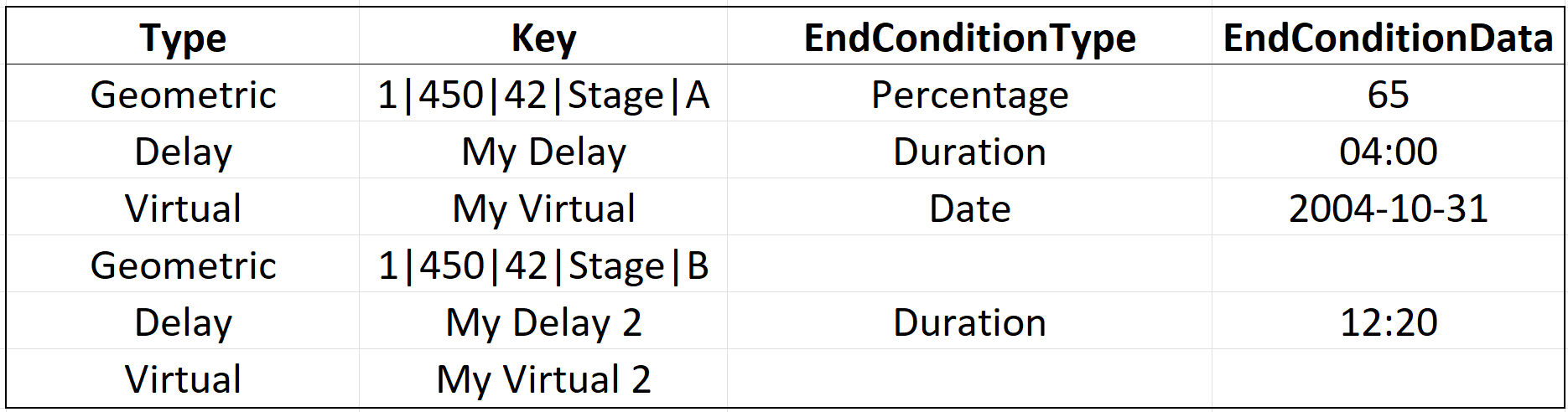 EndConditionData. The column contains the criteria for an end condition. You can leave this column blank, unless an EndConditionType is specified. For example, for a percentage EndConditionType, the EndConditionData must be a percentage value.