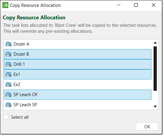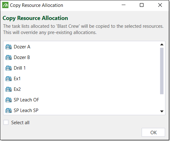 Select the resources you wish to copy the task list allocations to. Optionally, you can select the Select all checkbox which will copy the allocations to all of the resources.