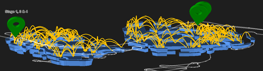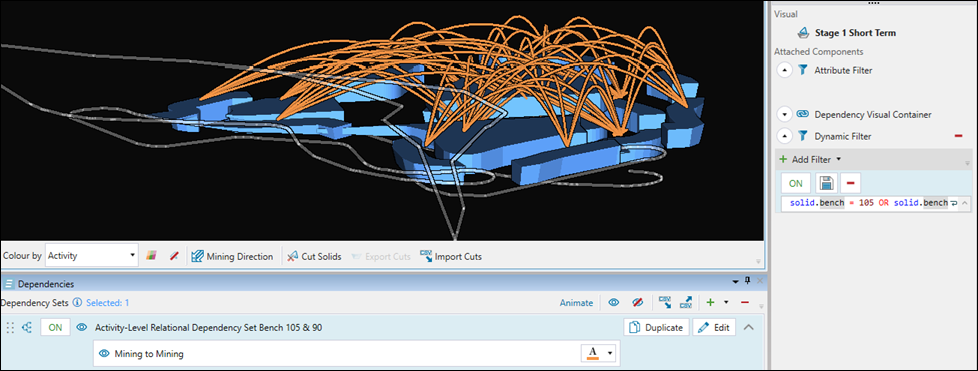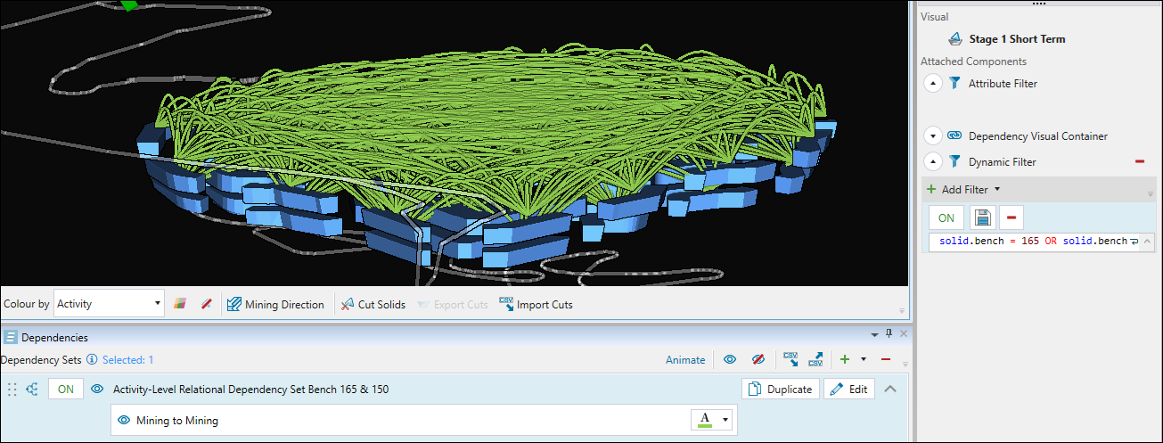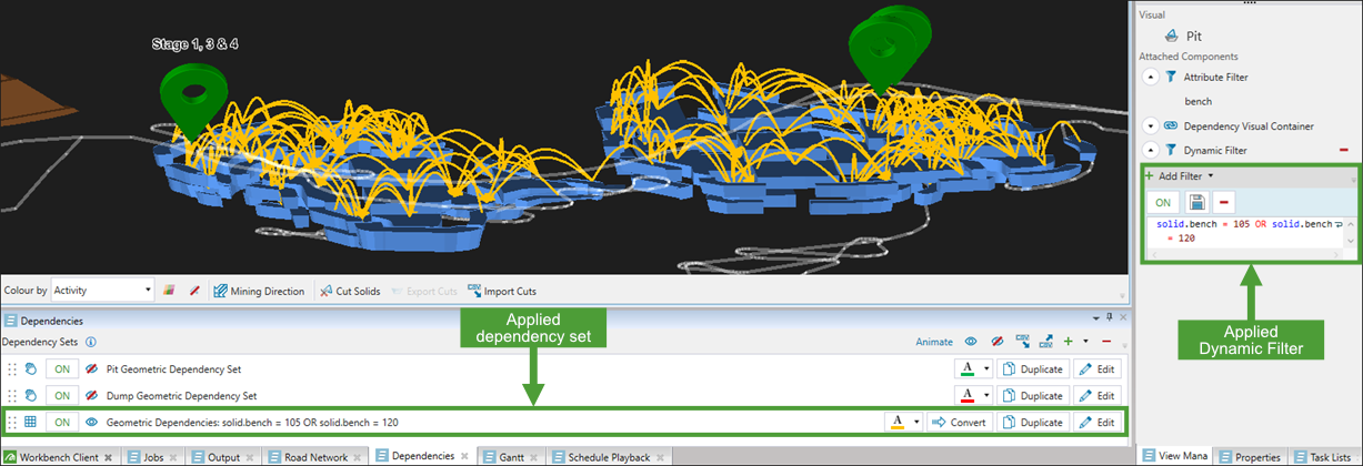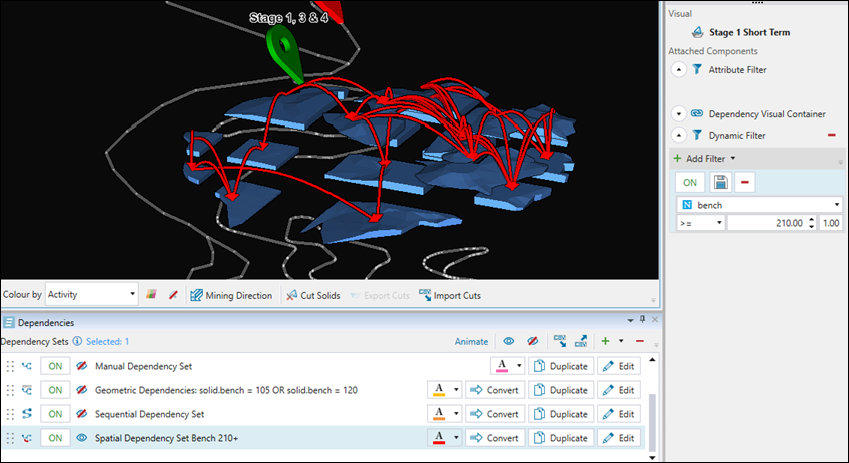 Tip: Use the Dynamic Filter to improve the visibility of the dependencies you have created within your model. In the example below, the model was filtered to display only the benches included in the Geometric dependency set.