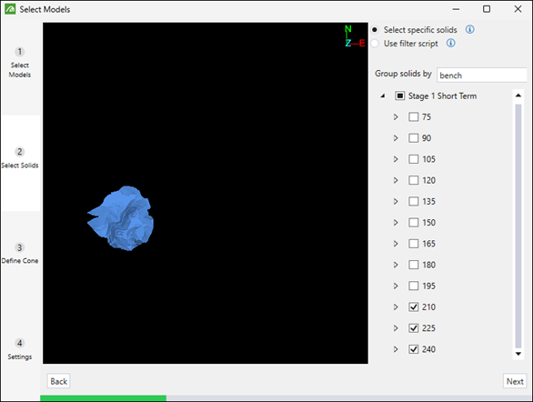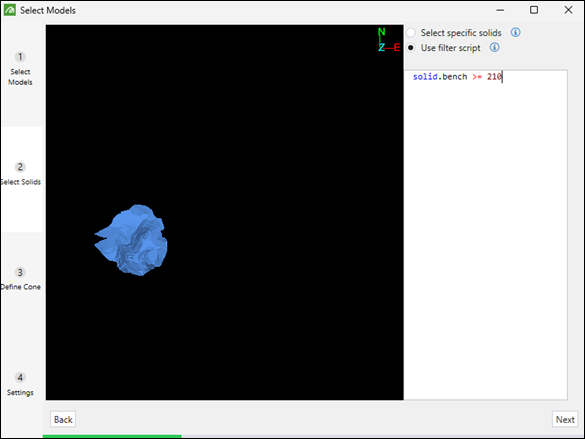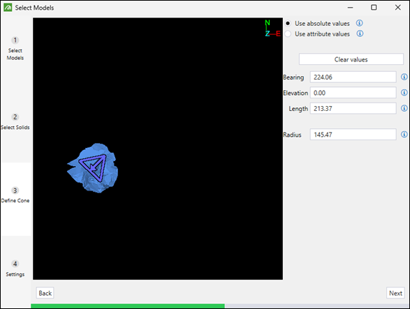 Tip: You can also define the cone by drawing it in the viewer in the Select Models panel.
