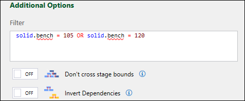 Add a dependency filter in the Filter field. Only the solids specified by the filter will be included in the generated dependencies. You can use any geometric attribute available in your model.
