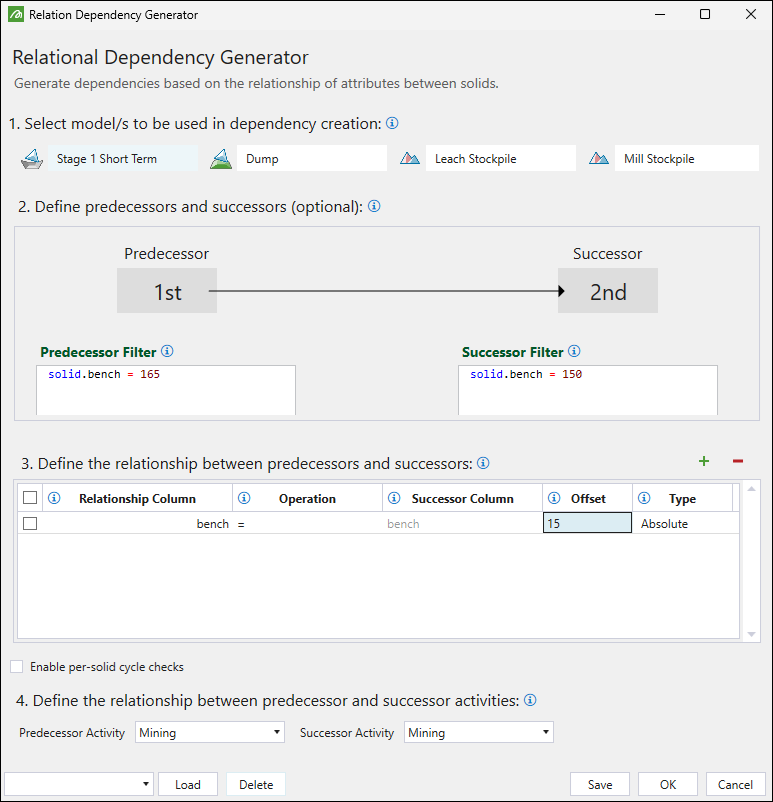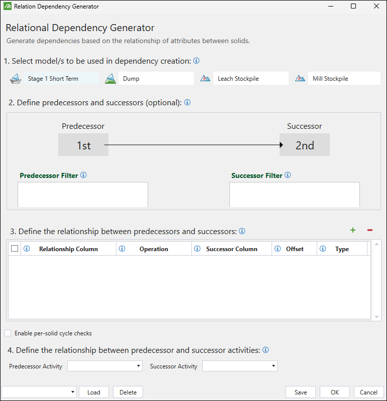 All previously saved relational dependency sets will be listed in the drop-down at the bottom of the Relational Dependency Generator panel. Select the required set from the list and click Load to populate the panel with the required settings.
