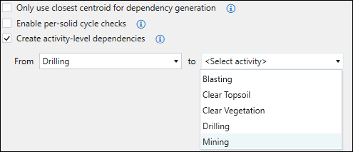 By default, Evolution creates solid-level dependencies. However, if you select this option, Evolution will create dependencies from the specified activity in each source solid to the specified activity in each target solid. To configure this option, select the required activities from the From and To drop-downs.