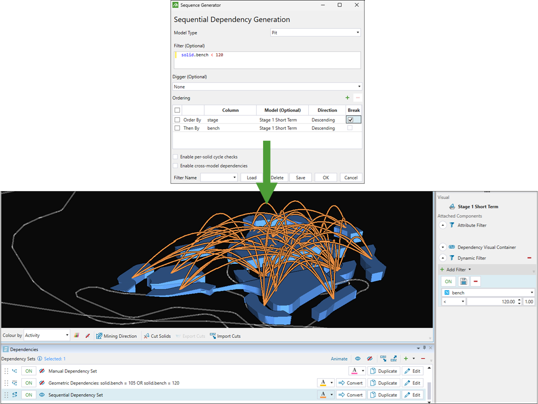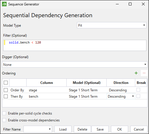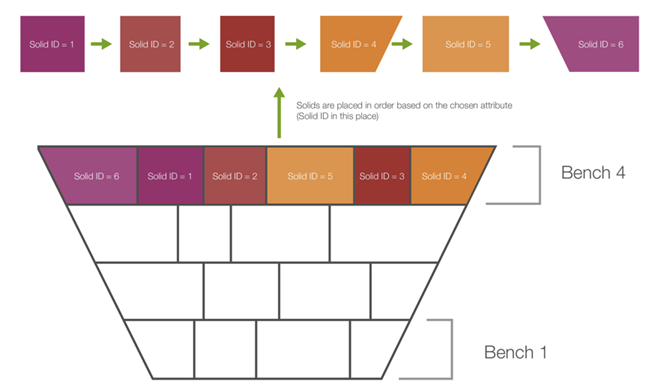 Sequential dependencies place solids in an order according to a variable that you select from the model. For sequential dependencies to be applicable, the value for each solid must be unique.