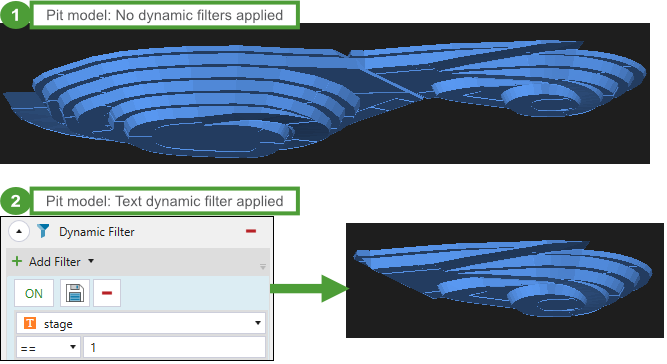 Allows you to customise the view of your model by applying a text value from the drop-down. In the example below, the model was filtered by applying stage
