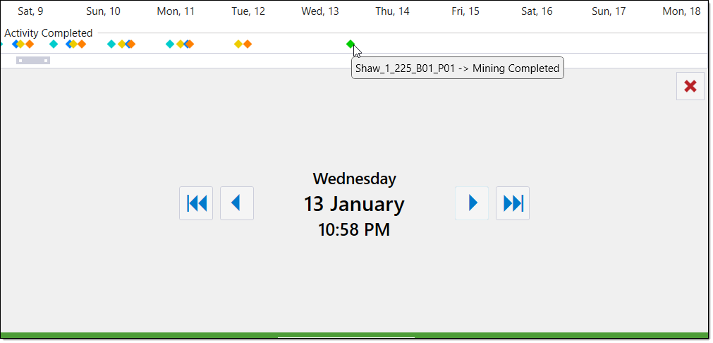 Markers. You can select a completed activity marker to view when the activity will be completed in the Schedule Playback workspace. The activity timeline will automatically shift to move the selected marker to the centre of the timeline.