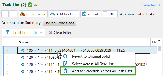 Add to Selection Across All Task Lists from the context menu to select all tasks corresponding to this solid across all task lists.