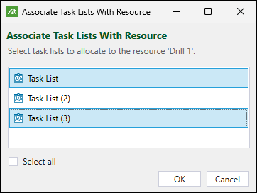 (Allocate task list to a resource). Next, in the Associate Task Lists With Resource panel, select task lists that you wish to allocate to the selected resource. Click OK to confirm your selection.
