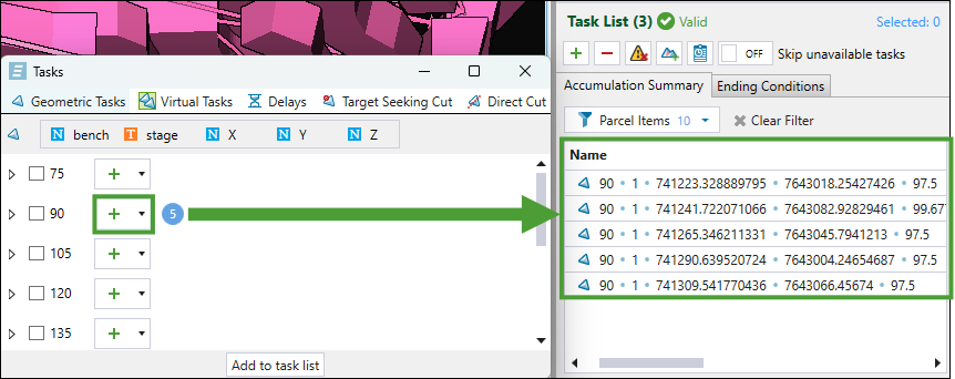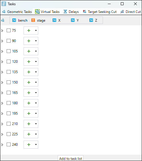 Geometric Tasks tab from the Tasks Templates panel.Epoch will display the geometric tasks in order of the task key definition. For example, if the task has the attribute definition of bench, stage, X, Y, and Z, then the geometric tasks will appear in this order, in a hierarchical tree structure.