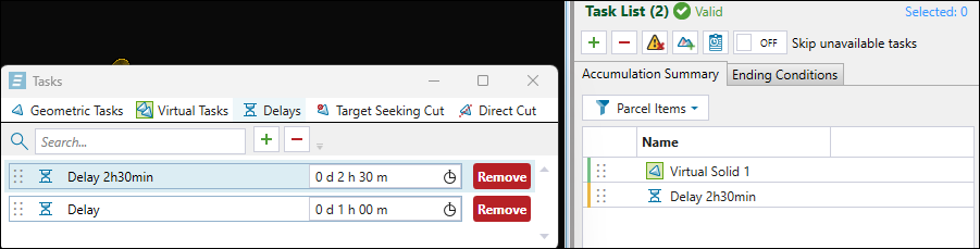 Drag the previously set delay from the Tasks panel to the required position in the Task List table or click