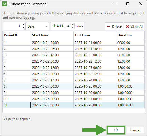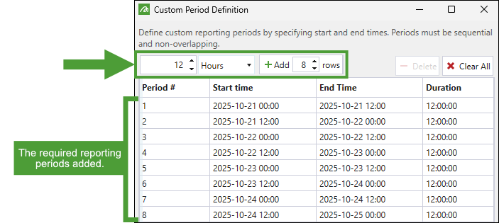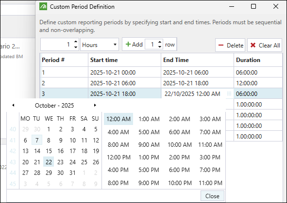 To configure custom reporting periods, double-click on the Start time or End Time of a period to enable editing. Enter the required date and time manually or click