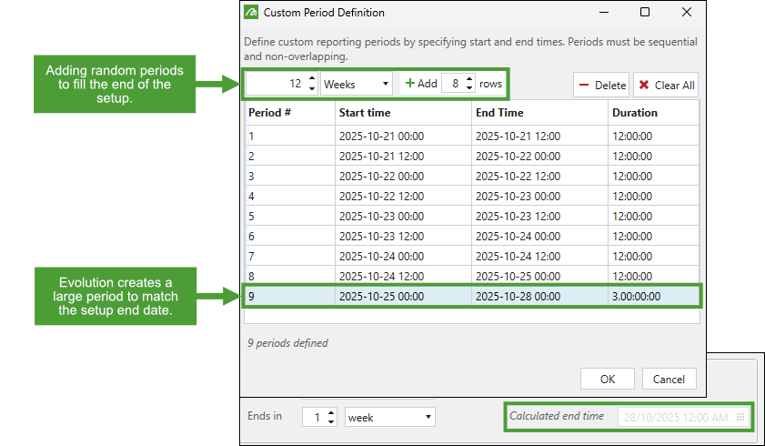 If you prioritise defining exact reporting periods only at the beginning and middle of your setup, and do not require them to be strictly defined towards the end, you can create a large reporting period at the end of the date range. Evolution will match the setup end date accordingly, as shown in the following example:Create the required reporting periods.