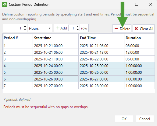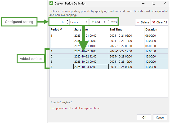 Important: Periods must be sequential and non-overlapping. The last period must end at setup end time.