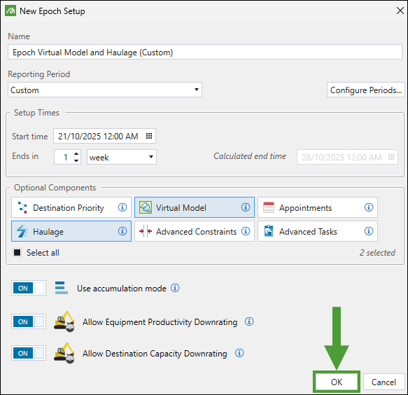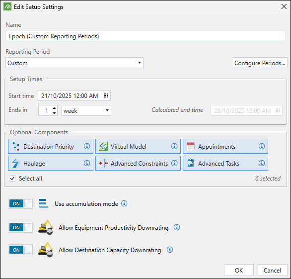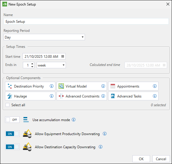 Allow Destination Capacity Downrating: Allow Epoch to slow digger operation to prevent ore waste when mills and stockpiles reach their capacity limits. If you choose to have this setting disabled, excess ore will overflow to waste.