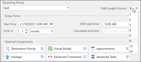 If you have selected Shift as the reporting period, specify the hourly shift length by choosing an option from the drop-down.