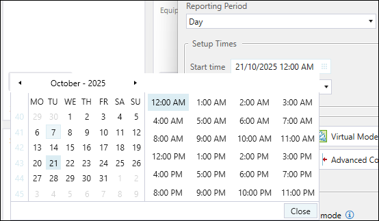 in the date field to select the starting time in the calendar. After setting the date and time, click Close to confirm.