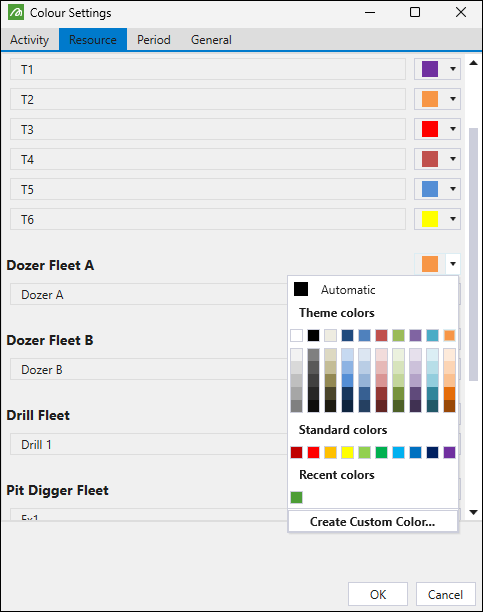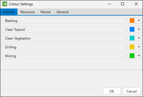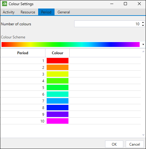 (Colour Settings), the Colour Settings panel containing four tabs (Activity, Resource, Period, and General) will appear. Apply the required colours as follows: