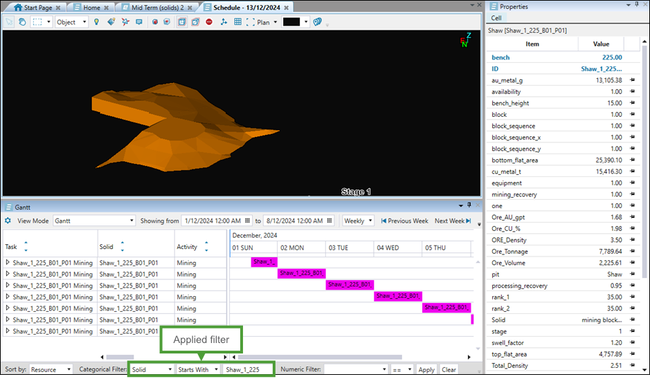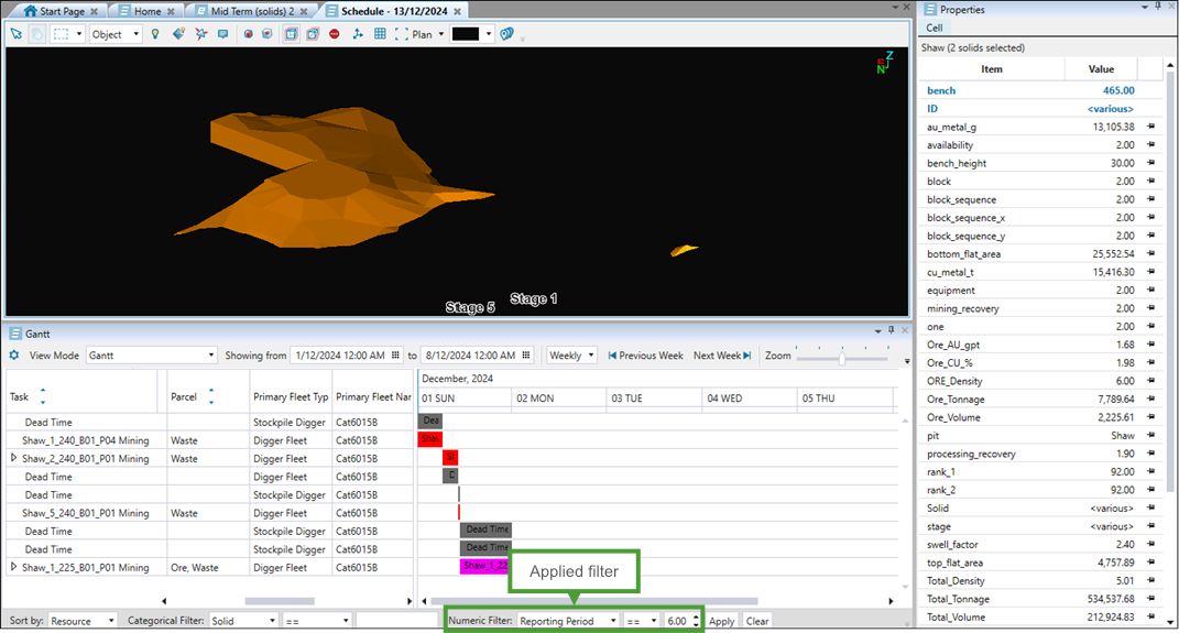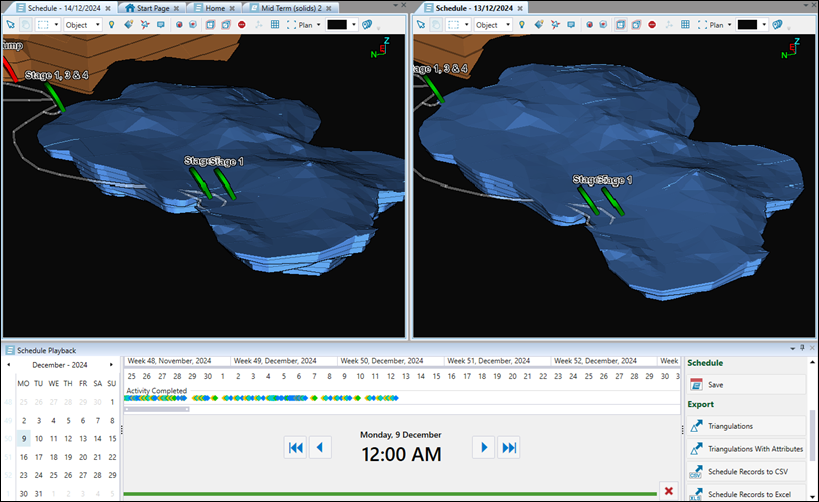 The partial solid cutting feature allows you to view incremental mining progress within individual solids as you step through your Epoch schedule. This feature cuts solids based on the actual mining progress, which provides a more accurate and intuitive visual representation of your mining operations in each period. This can help you visualise how different accumulations (tonnage, volume, or grades) are extracted over time and also analyse the timing and sequence of mining activities.