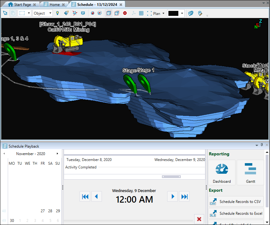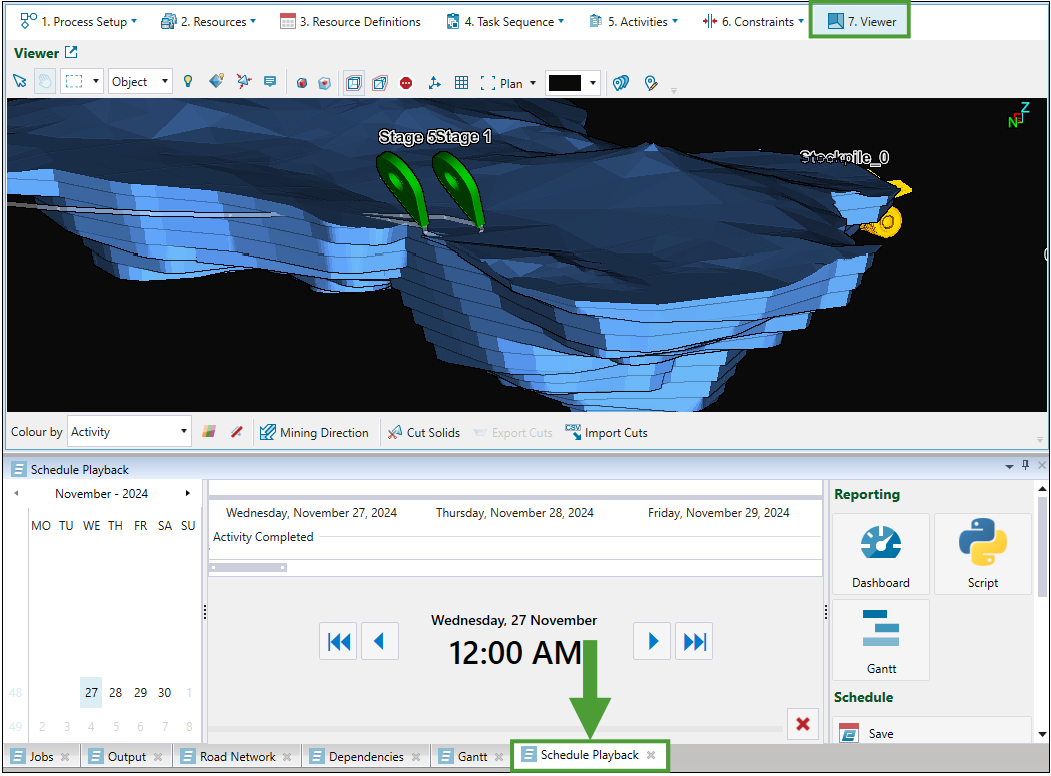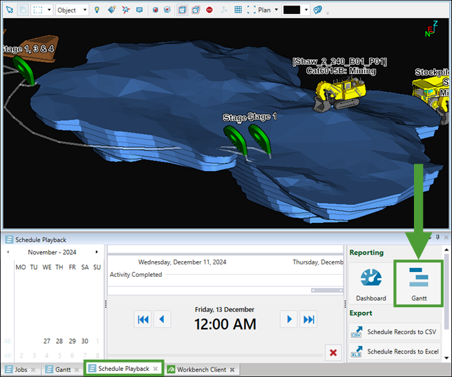 Navigate to the viewer, open the Schedule Playback tab, and select Gantt in the Reporting section.