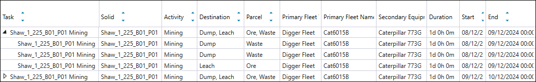 Epoch will display a child task for each parcel, destination, and equipment combination in your setup. For example, if two parcels were mined from a single solid, Epoch would display two child task entries.