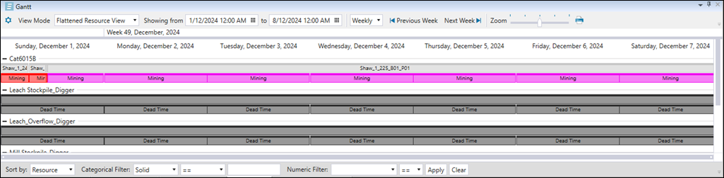 This flattened resource view mode contains an equipment-based timeline that displays the actions of each resource throughout the schedule.