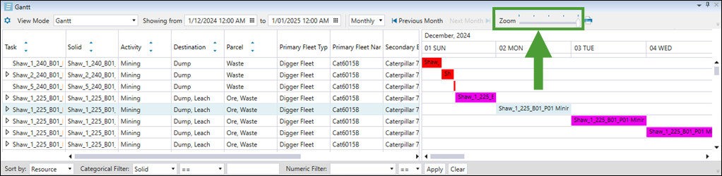 Using the Zoom slider, set the size of task tiles displayed in the Gantt chart.