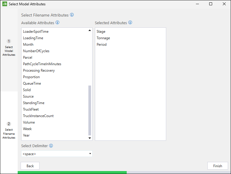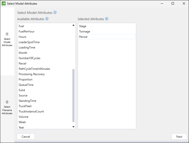 In the Select Model Attributes panel, specify the attributes that you want to stamp onto the exported triangulations by dragging them into the Selected Attributes field and click Next.