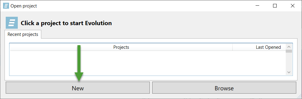 In order to begin, you need to create a new project. A project is an Evolution database where you can store models, setups, schedules, and scripts. A single project can store multiple setups and models.