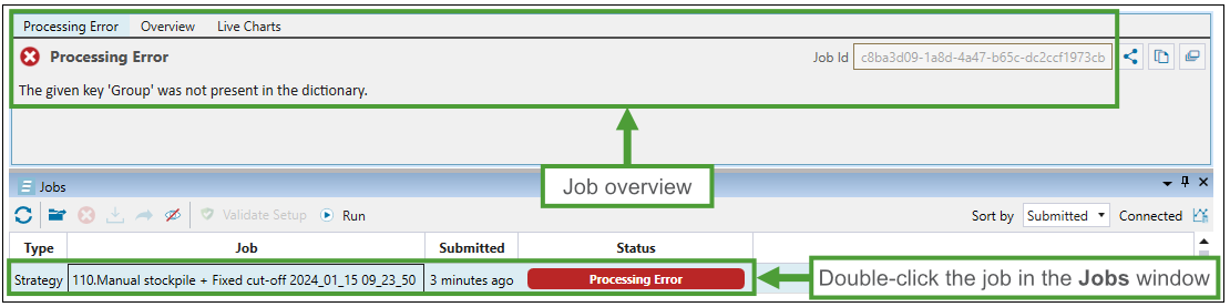 With any error that you encounter, you can contact Maptek by generating a support request. To attach all relevant information to your request, double-click on the job in the Jobs window. This will bring up the job overview.