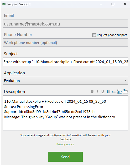 Submit the request for support by clicking Send.