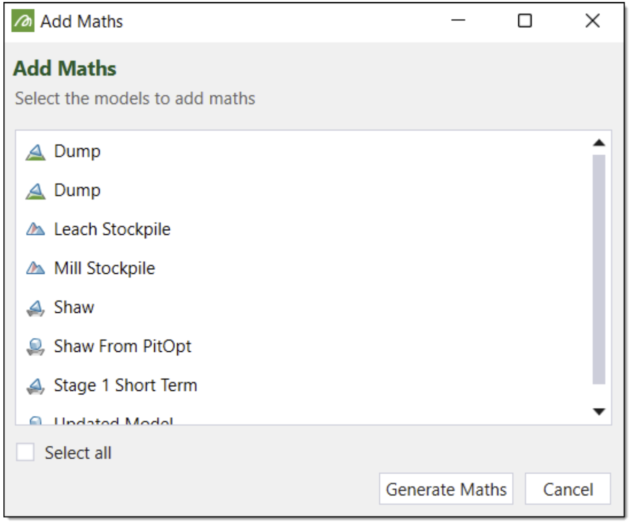 Select the model you wish to add the maths script to. Alternatively, you can click the Select all checkbox to add a maths script to every model.