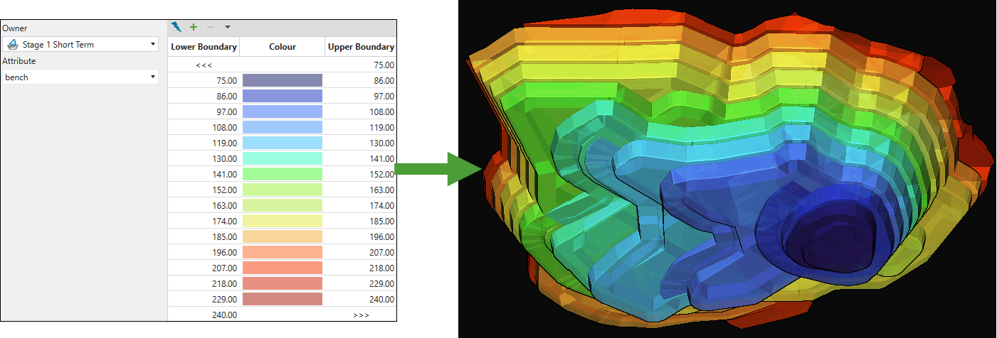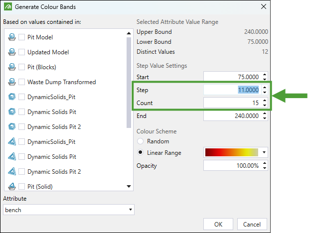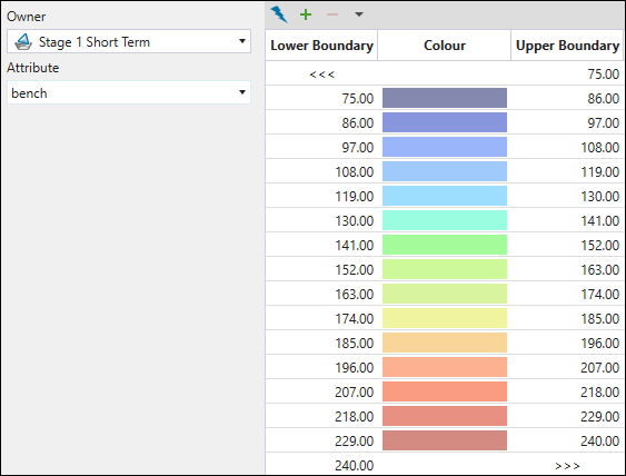 As shown in the example below, for the selected attribute (bench), the Step field has been set to11. As a result, the boundary of first colour (for bench 75) will be. Evolution automatically calculated the number of colour bands to be included (15 to reach bench 240).