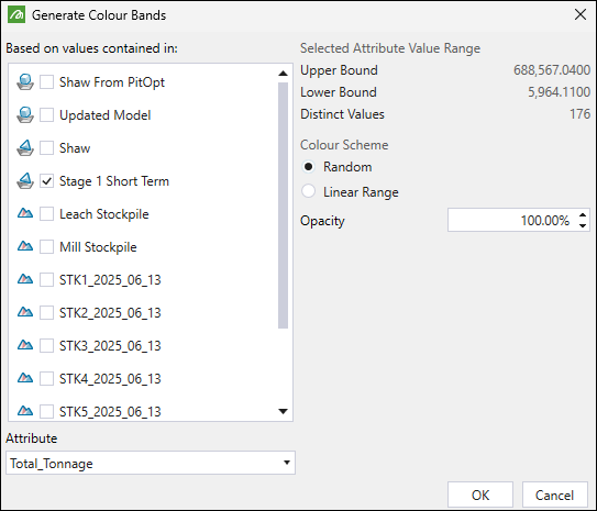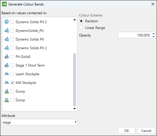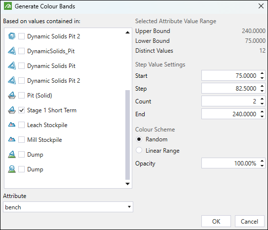 (Generate Colour keys). The Generate Colour Bands panel will appear. The Based on values contained in: and Attribute fields honour the Owner and Attribute selections you made in the workspace window.