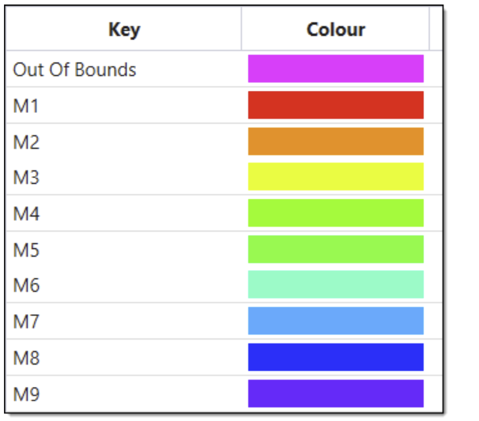 to generate a linear colour spectrum for the colour bands.Note: The first and last rows (ranges) will have an invisible colour applied.