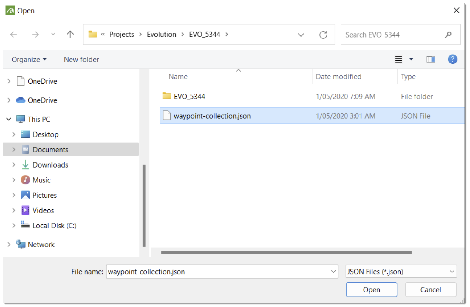 Click OK. Evolution will add the waypoint collection file to the project explorer.