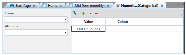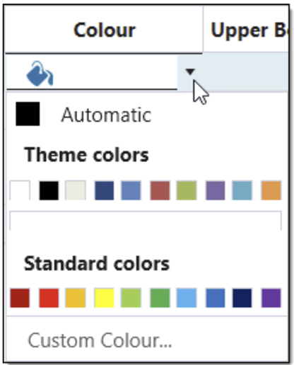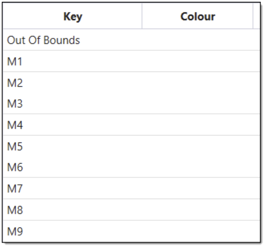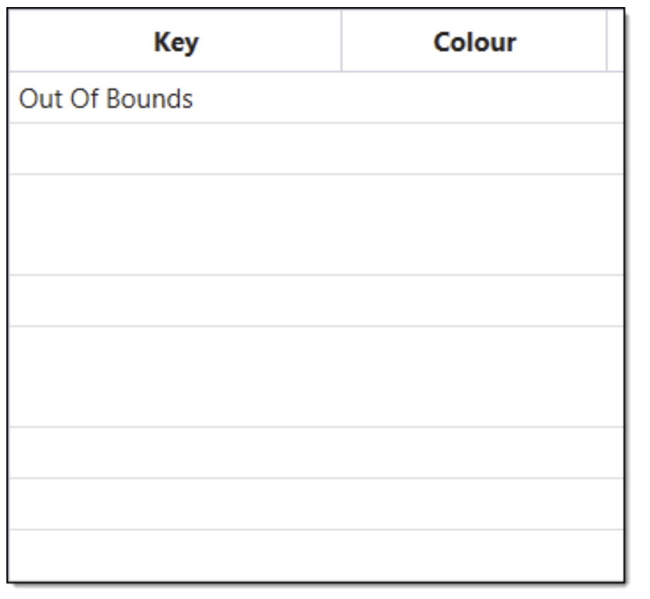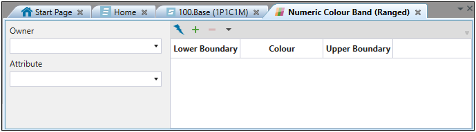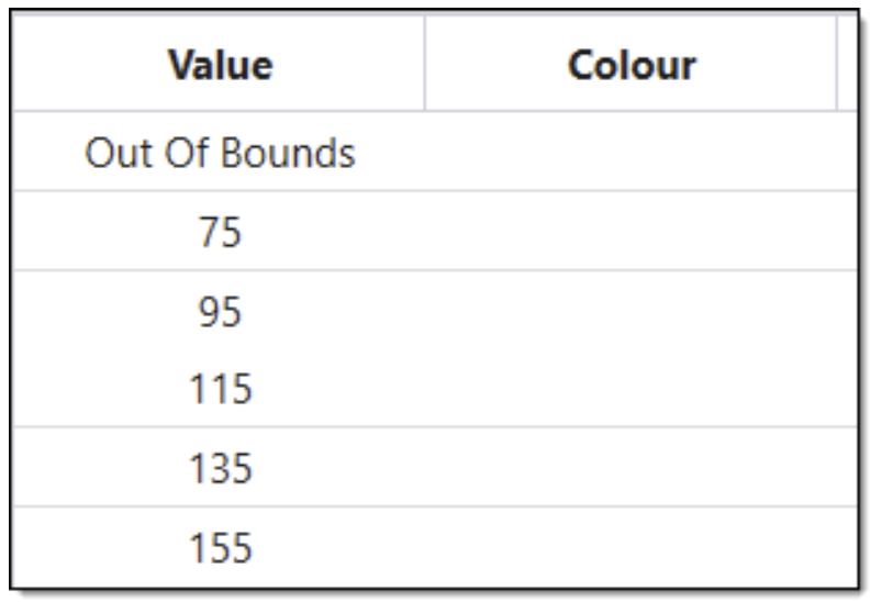 Numeric (Ranged): Defines colour bands by numeric ranges, with upper and lower boundaries. For steps on creating numeric (ranged) colour bands, see Creating numeric (ranged) colour bands.