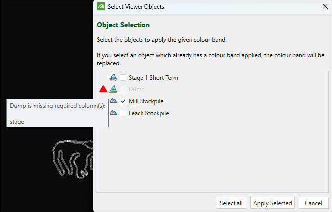 If you are viewing the model as a part of a setup, the Select Viewer Objects pop-up window will appear. Select the objects to apply the given colour band to and click Apply Selected.