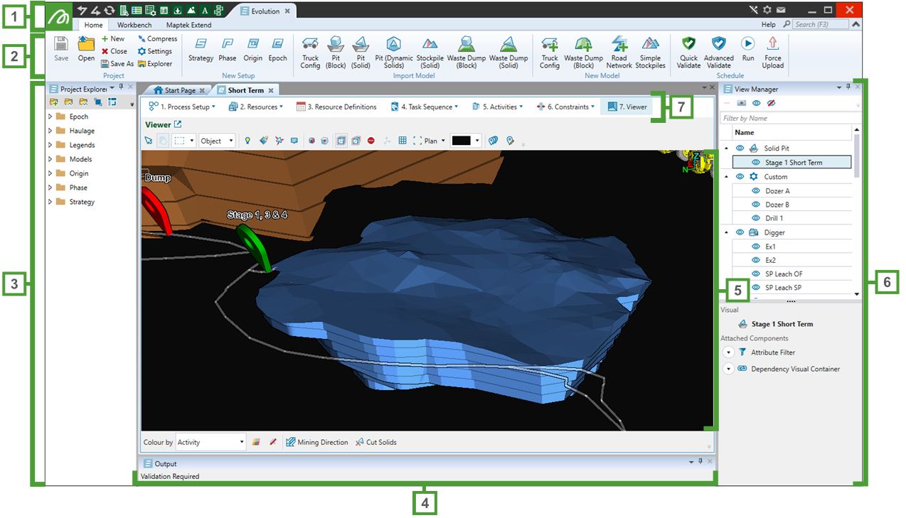 Evolution stores models, setups, and schedules in a single environment called a project. In a typical project, the display consists of the following elements when a setup is open.
