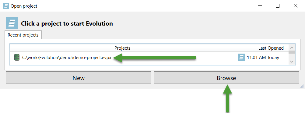 To open an existing project after you have launched Evolution, select a project under Recent Projects or click Browse and select a project with the file extension .evpx from the file explorer.