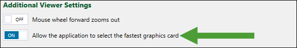 To ensure the best resolution and prevent viewer loading issues, keep the Allow the application to select the fastest graphics card setting enabled.
