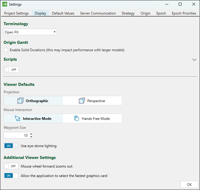 Use the Display tab to specify the terminology, enable solid durations and scripts, and to configure viewer settings.