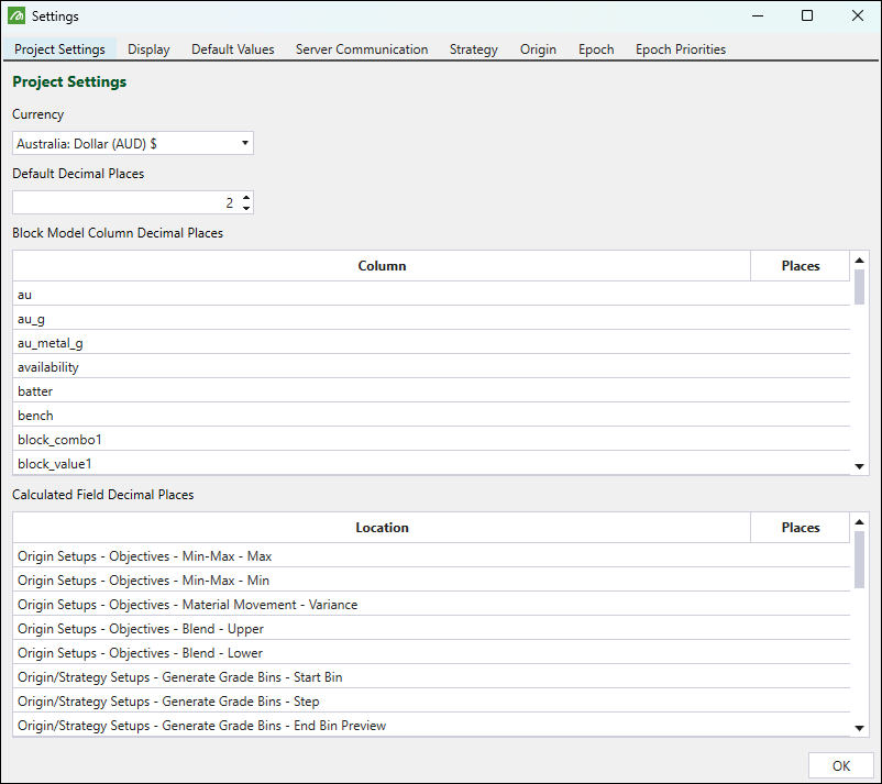 Use the Project Settings tab to set the required currency and the default decimal places value for each attribute.