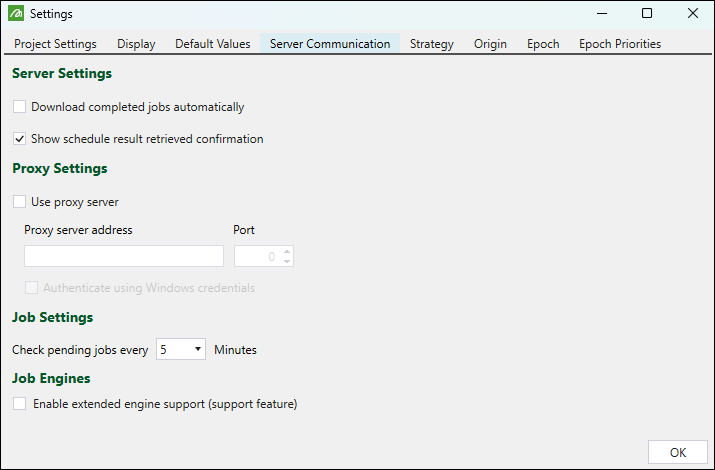 Use the Server Communication tab to edit the server, proxy, and job settings. You can set whether to download completed jobs automatically and set the schedule result confirmation. You can also set a proxy server and the interval for checking pending jobs.