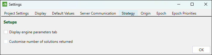 Use the Strategy tab to show or hide the Engine Parameters tab in Strategy setups and also to customise the number of solutions that Evolution will return.