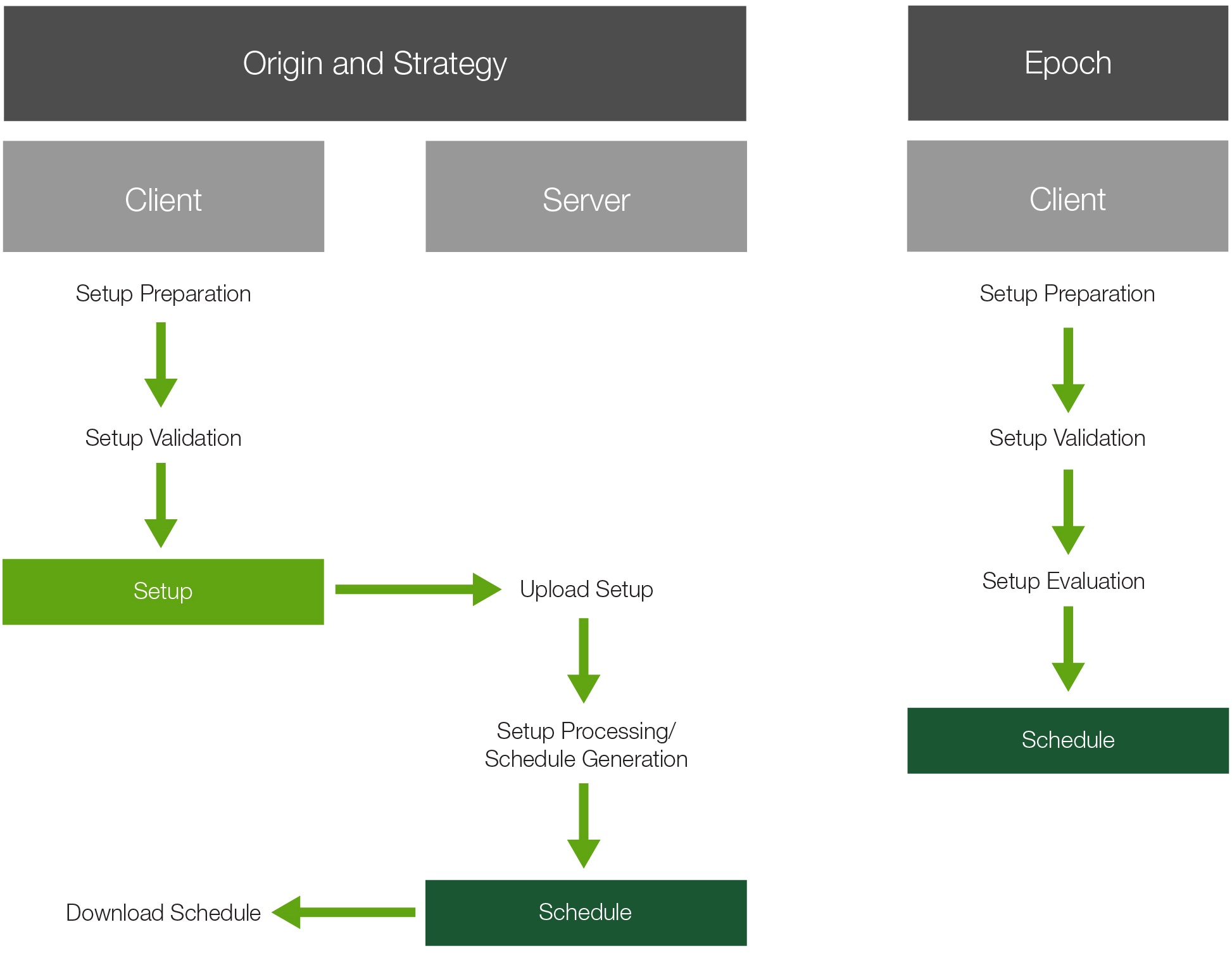 The process of generating a schedule can occur either via the server (a cloud-based service) or on the client (the desktop application). When the setup is configured correctly, the cloud will return a schedule and related information. This information can be exported as a CSV and further evaluated on the desktop application using Evolution’s reporting tools.