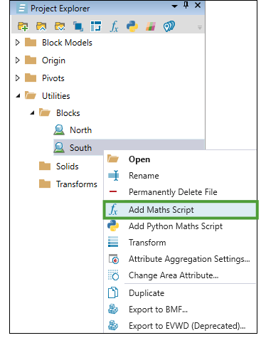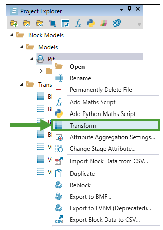To transform a block model, right-click on the pit model in the project explorer and select