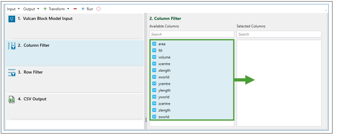 Column Filter to specify the attributes that should be included in the dataset. To do so, drag the required attributes to the Selected Columns field.