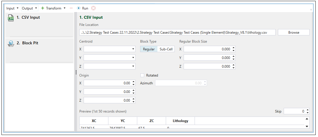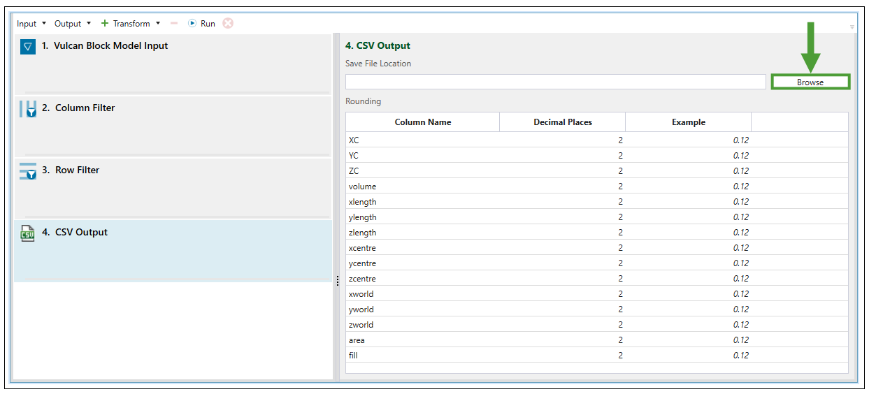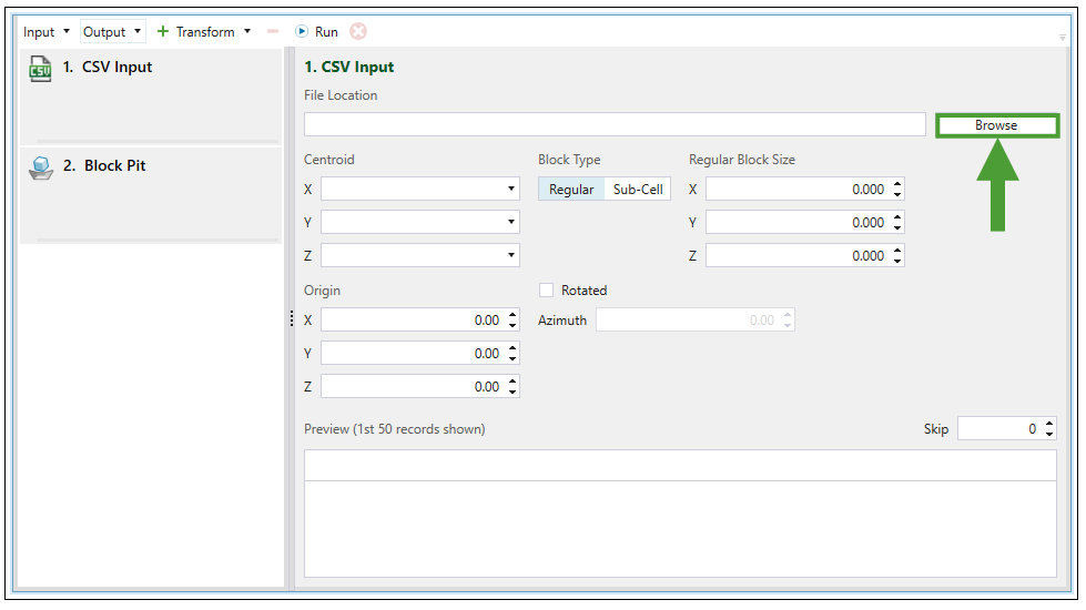 Once you have selected CSV File from the Input drop-down menu, the Block Model Transform screen in your viewer will be changed accordingly. Click Browse to load the data from the CSV file saved on your computer.